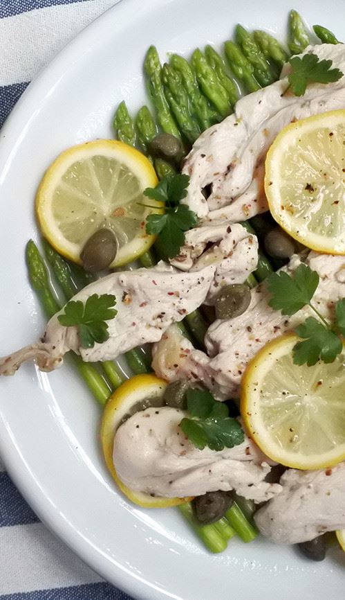 食材 : 雞胸肉、蘆筍、鹽、奧勒岡葉、黑胡椒、檸檬、酸豆、奶油 作法 : 1.雞胸肉撒上鹽、奧勒岡葉、黑胡椒和檸檬汁抓一抓。 2.蘆筍放進可微波的容器,加一大匙的水。 3.依序擺上雞胸肉、檸檬片和酸豆。 4.包上保鮮膜用牙籤戳幾個洞 5.微波兩分鐘➔拿出來拌一拌➔再微波兩分鐘或直到雞肉熟透。 6.將蘆筍、雞肉和檸檬片取出擺盤,容器裡剩下的湯汁放入奶油用餘溫使其融化,最後淋在雞肉和蘆筍上就完成了。
